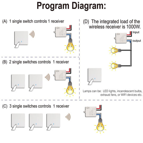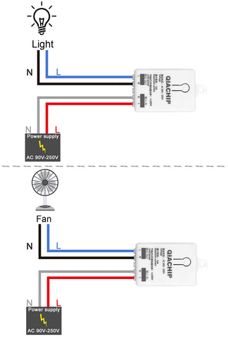 * Note: RF working modes need to be implemented with QIACHIP brand remote control (transmitter) and controller (receiver / wireless remote control switch). There is no guarantee that remote controls from other brands will work properly.