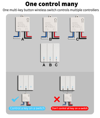 Click the Settings button on the receiver once, wait for the LED to light up, and enter the setting state; then click the button (such as button A) on the remote control once, when the indicator light on the receiver flashes and goes out, the toggle mode setting is successful.