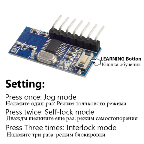 Learning remote code: press learning key once, twice or three times (see below).LED turns on: learning mode is active. Press any button of the remote control.LED indicator flashes three times: learning successfully completed.
